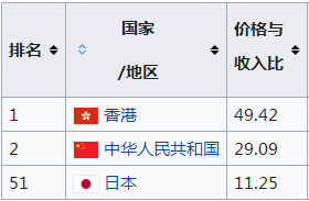 房?jī)r(jià)收入比是指一個(gè)地區(qū)一套住房的平均總價(jià)與當(dāng)?shù)鼐用窦彝テ骄晔杖氲谋戎担欠浅V匾暮饬恐笜?biāo)。一般而言,世界公認(rèn)比較合理的房?jī)r(jià)收入比為 6 ,超過(guò)的數(shù)值越大則房?jī)r(jià)泡沫越大。在全球房?jī)r(jià)收入比排名中,位列第1的為中國(guó)香港為49.42,排名第2位的是中國(guó)大陸為29.09,日本排在第51位為11.29。房?jī)r(jià)收入比是否合理,房?jī)r(jià)是否有泡沫,房產(chǎn)投資是否具有風(fēng)險(xiǎn)等問(wèn)題也就明了了。