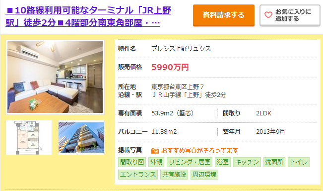 距JR山手線上野車站步行7分鐘的二手房,2013年建的面積為53.9㎡的2LDK公寓的售價是5990萬日元。