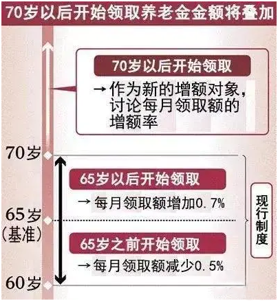 目前日本養(yǎng)老金領取開始年齡原則上是從65歲開始,日本的延遲退休政策一旦正式實施,退休年齡將延遲到70歲。不過現階段可以選擇彈性退休年齡,即可以選擇開始領取養(yǎng)老金的年齡為60歲到70歲之間。根據開始領取的年齡的不同,養(yǎng)老金的金額略有不同,提前領取的金額每月將減少0.5%左右,延遲領取的金額每月增加0.7%左右,越晚開始領養(yǎng)老金的金額越多。