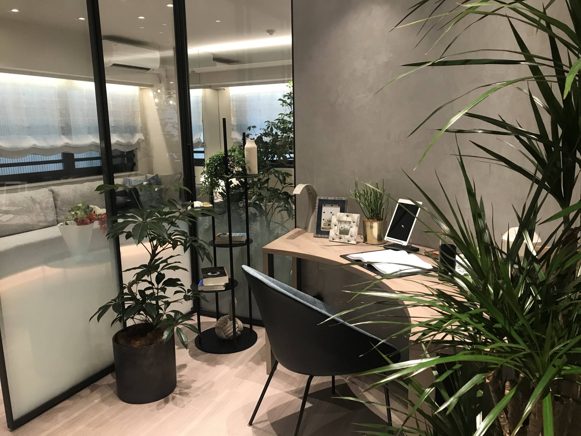 日本的設計師非常擅長放大面積的空間感,70平方米左右的面積看起來更像豪宅的寬敞明亮。特別是新冠肺炎疫情席卷全球以來,在家辦公成為生活的主要模式,家里不單是休息的地方,更是承擔了日常辦公的功能。拆掉書房的隔斷墻,以落地玻璃隔斷取而代之,并一反常態地將直角墻改為弧形,空間更顯靈動,私人辦公室的時尚感立馬呈現出來。而且玻璃隔斷墻也打破了以往“一隔到窗”的設計,而是根據功能和需求協調空間,增加了客廳的面積。在視覺效果上,玻璃書房更顯通透,視覺空間寬敞。延伸的客廳也顯得寬敞大氣,即使同事一起開會都不成問題。書房采取了“雙門”設計,可以根據需要隨時切換“公、私”的空間,兩個門都打開時書房便成了背景墻,室內空間更顯得寬敞通透,使用更方便。而使用玻璃隔斷墻特意打造出來的綠植空間,再配合玻璃隔斷,儼然打造出了充滿氧氣的植物園,再配合廚房、臥室、陽臺等擺放的綠植,相互呼應,讓人感嘆生活的在自然中的美好。
