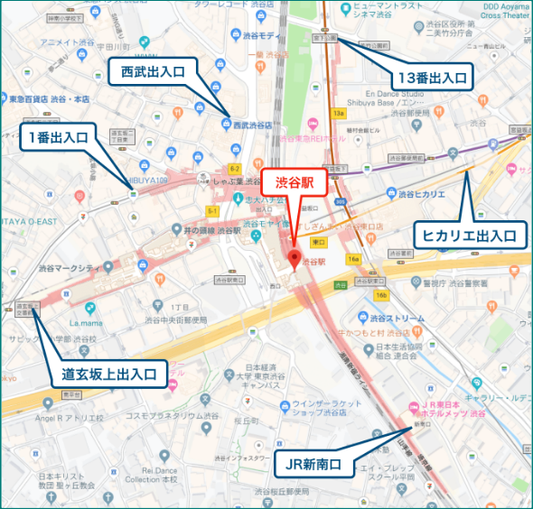 涉谷站是大站,出入口較多,不過新的問題是步行通過車站到不同的出入口的距離相對較遠。比如從JR新南口出入口到東京地下鐵出入口,經由地下通道即使在通行順暢情況下步行也需要10分鐘以上。萬一走錯了出口,步行時間可能就要超過20分鐘了,所以要特別注意。