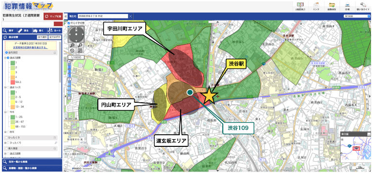 涉谷車站人流量較大,以車站為界會發現有的特定區域的治安狀況非常不好,從警視廳發布的犯罪信息地圖就可以清楚的看到。