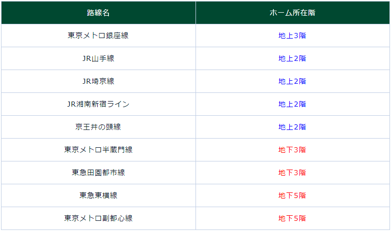 涉谷站是換乘大站,雖然出行乘車有多條線路可以選擇,不過正因為線路過多,車站建成了高低落差很大的立體車站建筑,所以根據需要搭乘電車路線的不同,要前往不同樓層的站臺乘車。 此外,涉谷車站在通勤高峰時段人流量較大,在前往各站臺換乘之前,樓梯、自動扶梯容易堵塞,無法按時乘坐既定班次的電車也是常有的事。以下是涉谷站內可以乘坐的電車和各路線的月臺所在樓層。