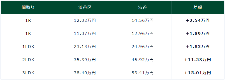 隨著涉谷站周邊的再開發工程,房地產行情上漲較快,涉谷站周邊的房租水平也成比例地升高。下表將整個涉谷區的物件和從涉谷站步行10分鐘以內的物件的房租行情進行了比較。