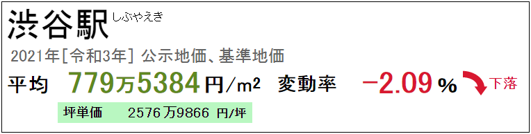 涉谷站是山手線等多條線路上重要的一個大站,2021年的公示地價、基準地價為每平方米779.5384萬日元。涉谷站周邊的地價近年來呈持續上漲趨勢,商業用地較多,因受到新冠肺炎疫情的影響略有下降。但隨著涉谷站再開發工程的完工,地價將有進一步上漲的空間。