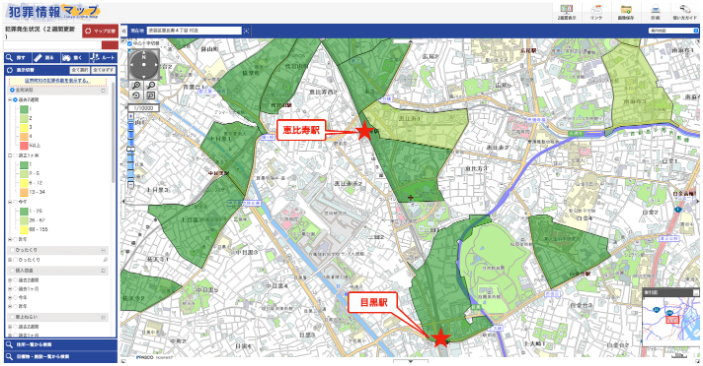 目黑雖然離市中心非常近,但是車(chē)站周邊犯罪發(fā)生的件數(shù)也很少,治安良好,生活很方便。推薦給有孩子的家庭、獨(dú)居女性以及擔(dān)心治安的外國(guó)人。以下是警視廳發(fā)布的“犯罪信息地圖”,與周邊人氣的“惠比壽”相比,目黑的犯罪件數(shù)也很少。