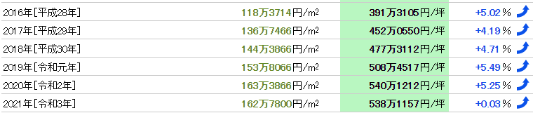 目黑站2021年公示的基準(zhǔn)地價(jià)為每平方米162.78萬(wàn)日元,多年來(lái)呈持續(xù)上漲趨勢(shì)。