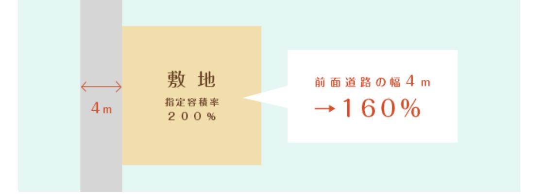 也就是說,當(dāng)建筑物前面道路的寬度為4m時,容積率為4×0.4×100=160%。即使城市規(guī)劃中容積率被認(rèn)定為200%,但與以前面道路為基礎(chǔ)的計(jì)算公式中算出的容積率相比,規(guī)定將較小的作為當(dāng)?shù)氐娜莘e率。順便說一下,像角地那樣面向多條道路的土地,以寬度較寬為基準(zhǔn)進(jìn)行計(jì)算。