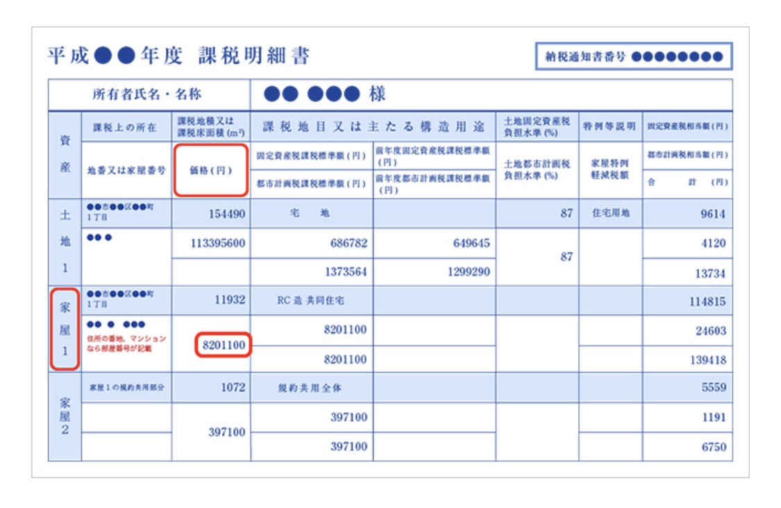 上面的圖片是固定資產稅納稅通知書的“課稅明細表”。雖然寫著各種各樣的數字,但固定資產稅評價額是在“價格”欄里寫的數字。例如,“房屋1”的“價格”欄中記載的“8201100”這個數字是820萬1100日元,就是對所有公寓的專有部分的固定資產稅評價額。