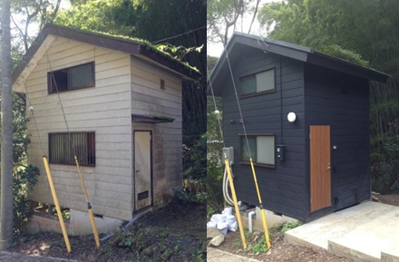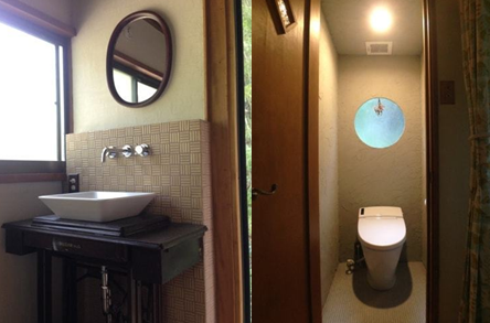 小別墅的外墻原本是白色的膠合板材質,顯得有些臟了,于是A先生直接將外墻刷上高級感的黑色油漆。由于小別墅的面積不大,單層大概只有六貼榻榻米大小。于是,為了增加房子的視覺效果,以及便于欣賞外面的山林風景,A先生將一層視角最好的窗戶改為大玻璃的落地窗。木地板也是自己鋪裝的。日本的建材很規矩,都是按照六貼、八貼等這樣的規格裁制的,看起來很有高級感的木地板鋪裝起來其實很方便。為了住人使用,A先生還增加了洗手盆的位置,洗手盆的架子是用祖母的梳妝臺改造的,白色的仿陶瓷洗手盆也是從建材市場用很低廉的價格購買的,水盆后面的墻壁是自己貼的馬賽克,當然水管也是自己接的。因為空間不大,他就把衛生間設置在了房間的一角,并在墻上打了一個圓孔、裝上玻璃,配有馬桶的衛生間瞬間就變得很有氣質。A先生還考慮到了洗澡的需求,于是在建材市場購買了整體淋浴房,這可能是整間別墅最貴的一件裝修材料了。內墻壁他也是自己刷的漆。順著樓梯走上二樓,為了營造舒適的居住感,A先生還特意在主墻面上貼了壁紙,地板則是日式傳統的榻榻米。
