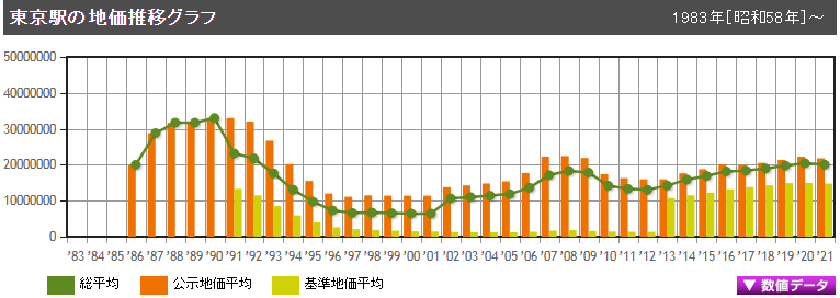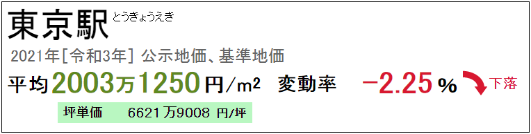 東京站2021年3月公示的基準地價為每平方米2003.125萬日元,近年來地價持續上升,因受疫情的影響略有下降。