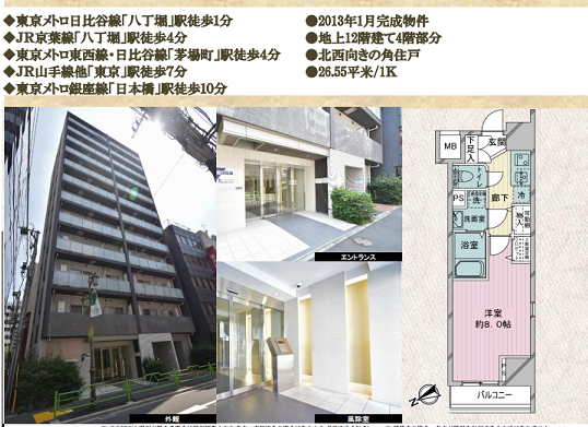 距東京車站步行7分鐘,面積為26.55㎡建于2013年1月的1K戶型的二手房售價為3850萬日元。