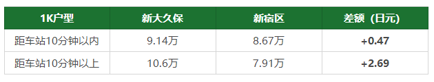 以1K戶型為例,距離車站步行10分鐘以內的物件月租金約9.14萬日元,步行超過10分鐘的物件租金約10.6萬日元。比較了新宿區同等條件的房源,距離車站步行10分鐘以內的物件月租金約8.67萬日元,步行超過10分鐘的物件租金約7.91萬日元。由此可以看出來,新大久保的租金比區內平均租金行情還高了不少。