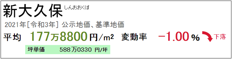 新大久保地區的地價近年來平穩上漲,2021年3月的公示地價為每平方米177.88萬日元。因受新冠肺炎疫情的影響,價格稍有下降但與往年相比,差異不大。