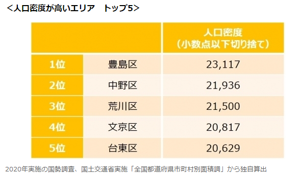 很意外,豐島區竟然榮登榜首。其實,這與豐島區內擁有眾多大學和大型商業設施有關,非常擁有人氣的池袋車站也在區內。豐島區的交通四通八達——通勤方便;生活配套設施完善——生活便利,再加上在區內居住的留學生、上班族等單身人口較多,因此豐島區就成為了東京人口密度最大的區。其次是中野區,荒川區,文京區及臺東區。