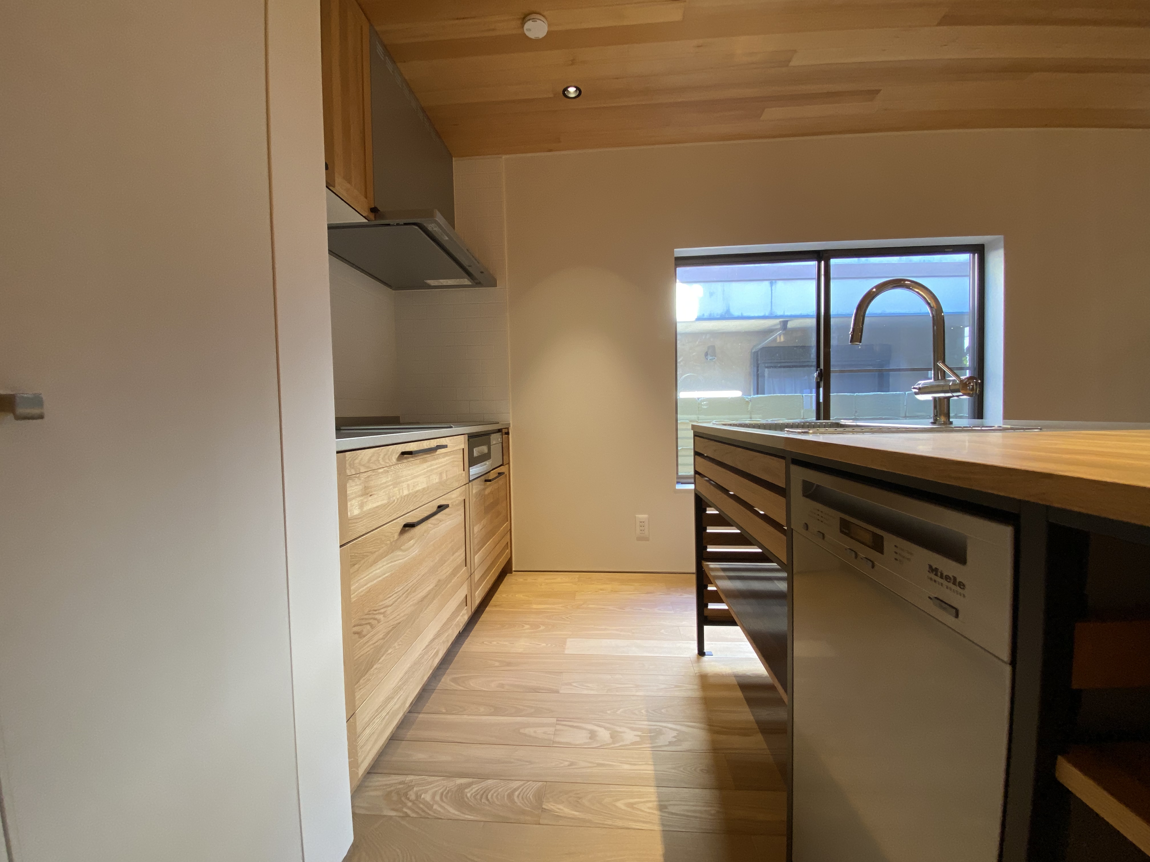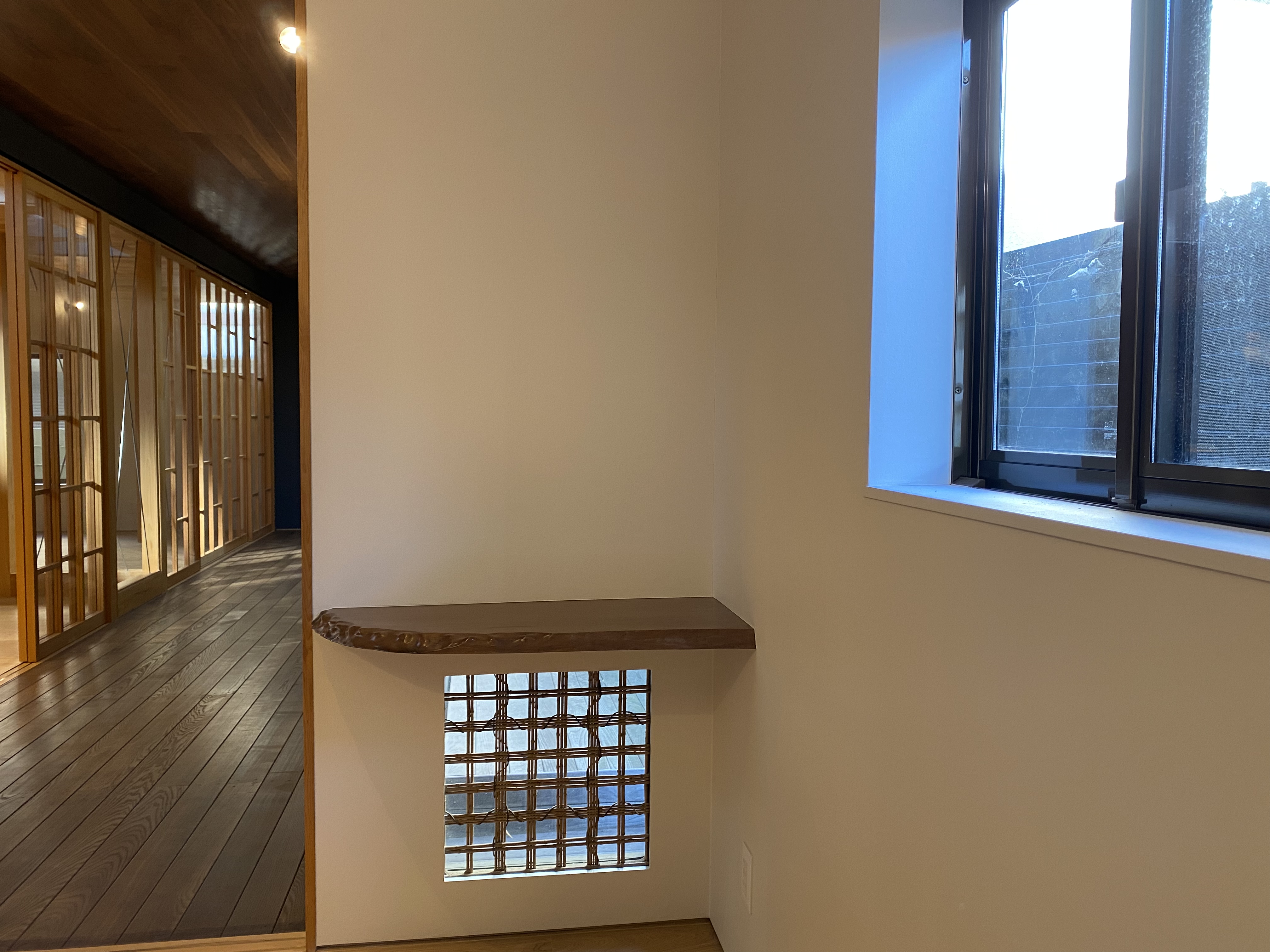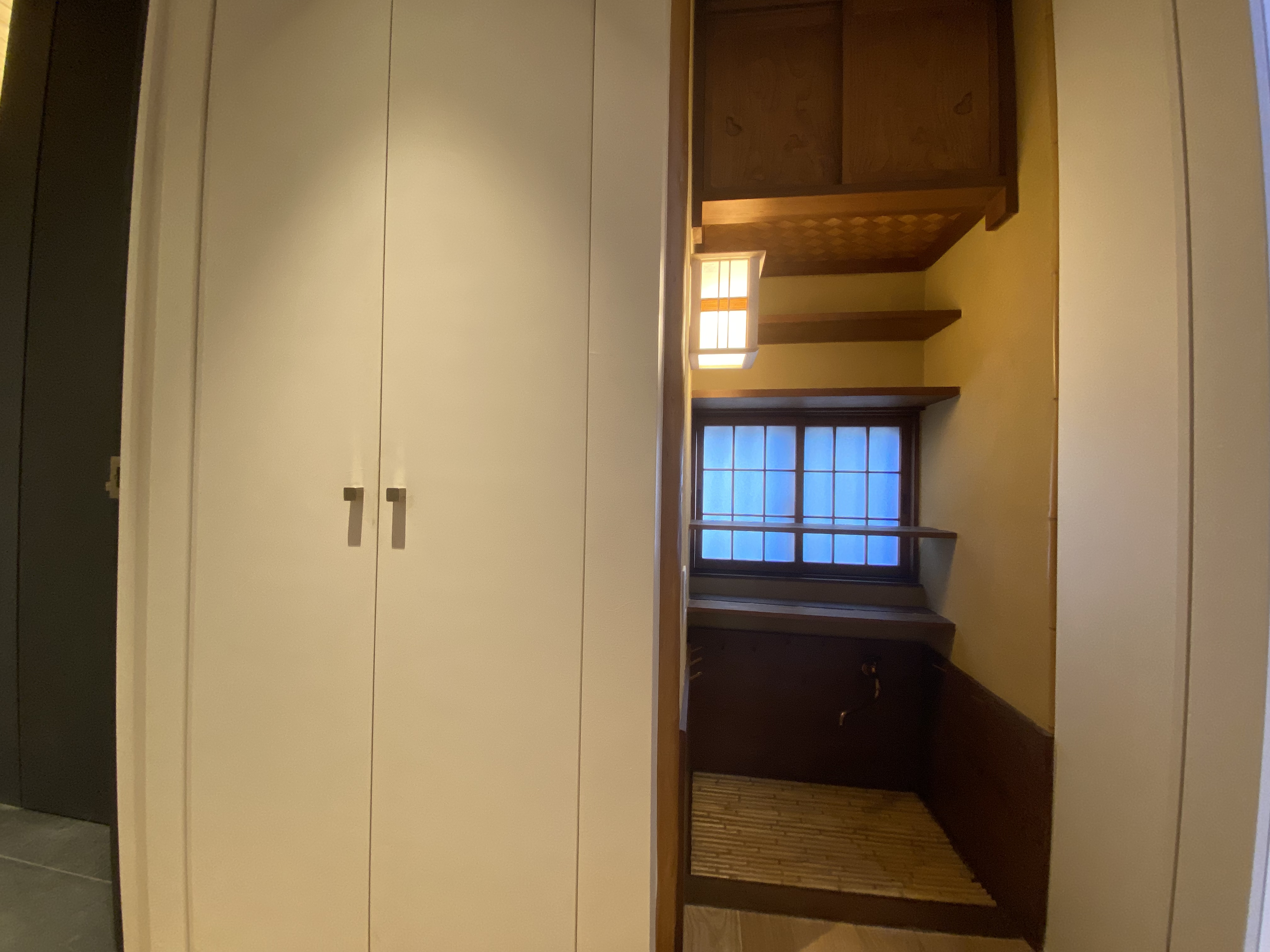 獨立浴室外面依次是洗面臺和洗衣機放置場,但令人意外的是,這座房子還保留著傳統的“水屋”,可以看出老宅子講究至極的氣質。這個水屋不是隨便的一戶建都配備的,日本人注重“茶道”,愿與客人“品茶論道”,所以有品位的主人家基本都會在茶室旁邊配以“水屋”,也就是擺放茶具以及便于清洗茶具的地方。古代的時候,房屋里是沒有通自來水的,也沒有下水管道,在當時這個水屋的作用就非常之大了。設計師保留著這個水屋的部分,木制的頂柜、擺放茶具的隔板,以及墻壁也是使用的“砂壁”的特色,看到這里恍惚就穿越到過去的年代,藝術價值大于其功能,以“古董”的方式被保留下來,也是對過往的尊重。