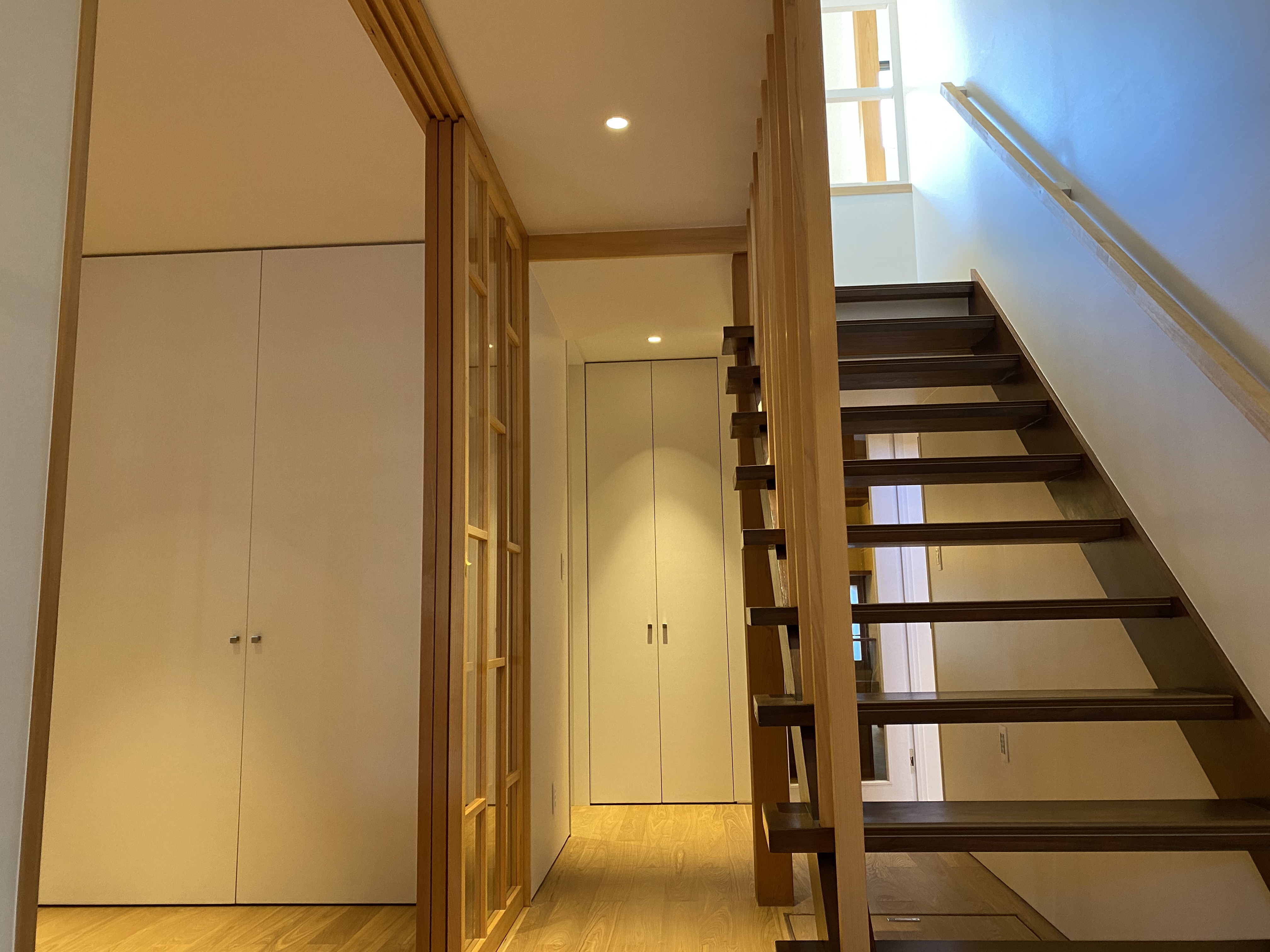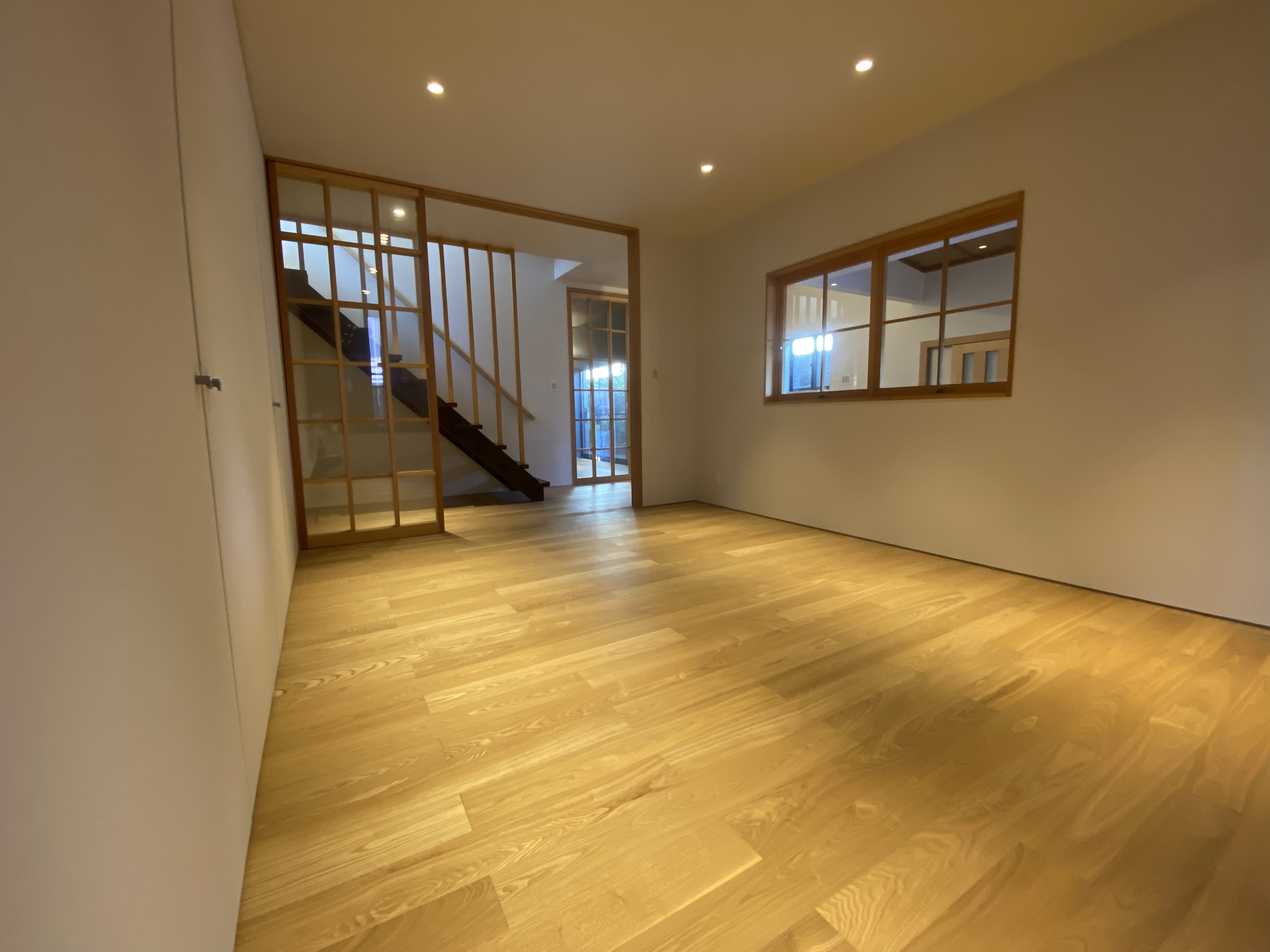 同樣可以印證年代的是入戶玄關出的衣柜和鞋柜,由于木材價格的不斷高漲,現在能使用整塊原木木板作為柜門,真是太奢侈了。從圖片更可以看出,柜門不但使用了整塊木板,而且也很注重木頭的花紋,以及花紋的對稱性。日本人不喜歡張楊,反而是從這些細節中透露出低調的奢華。整個房屋內部以暖色調的木色為主,讓空間充滿溫暖和自然之感。