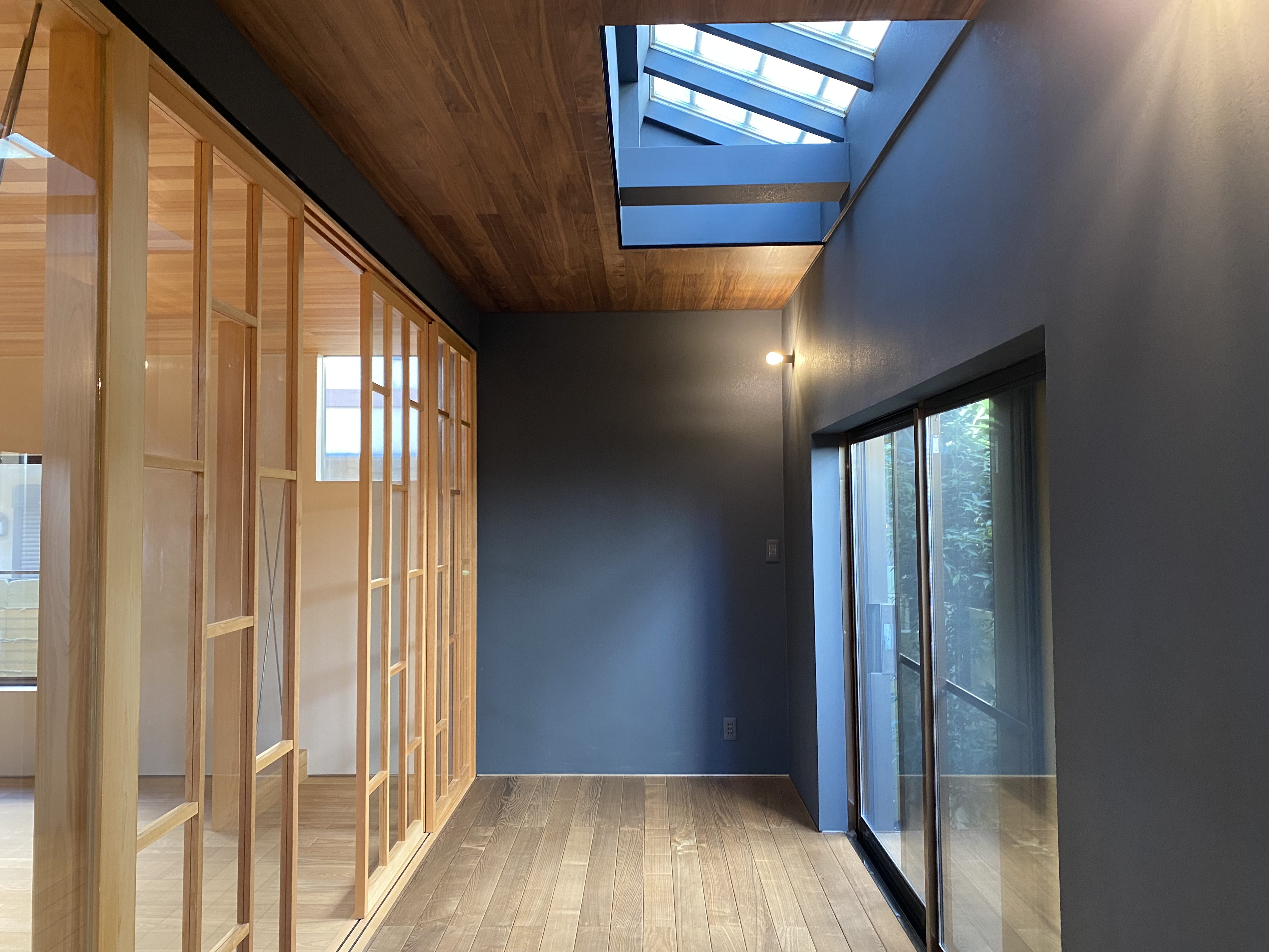 更巧妙的設計是,中庭和廚房外側的連廊,連接著房屋內、外。連廊上方還有天窗,增加了采光,使房間顯得通透、明亮,與寬大的落地窗相搭配,打開落地門窗便一眼可見院墻邊的翠竹,無論星晴雨雪,都可坐看云卷云舒。