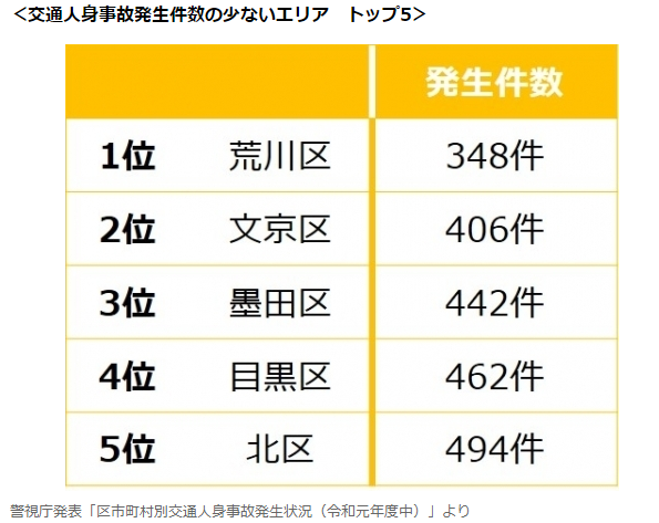 據(jù)統(tǒng)計,位于東京都東北部的荒川區(qū)全年共發(fā)生交通事故348件,平均每天發(fā)生不到1件,為23區(qū)發(fā)生人身交通事故最少的區(qū)域,同時也是發(fā)生刑事犯罪案件最少的區(qū),可謂是東京都內(nèi)安全系數(shù)最高的地方。人文環(huán)境較好的文京區(qū)全年僅發(fā)生人身交通事故406件,位列第二位。其次是墨田區(qū)(442件)、目黑區(qū)(462件)及北區(qū)(494件)。