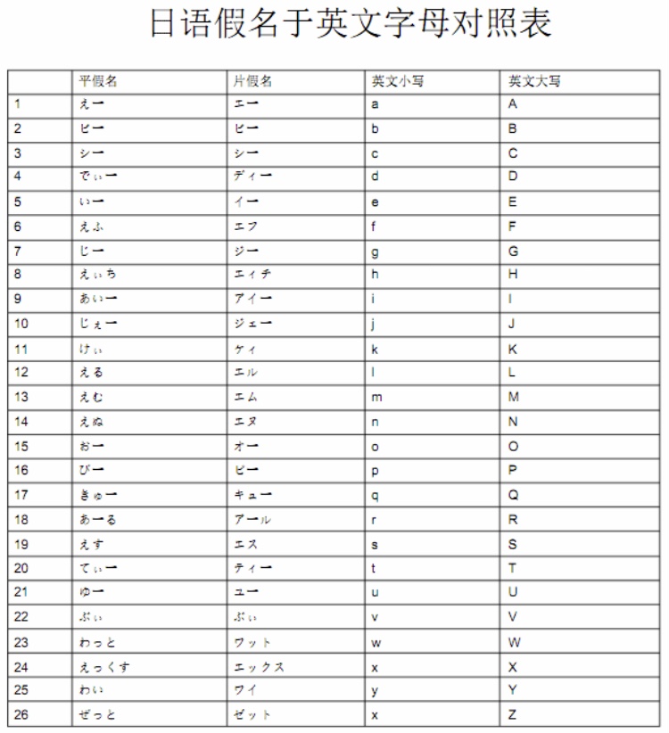日語假名于英文字母對照表 平假名 片假名 英文小寫 英文大寫