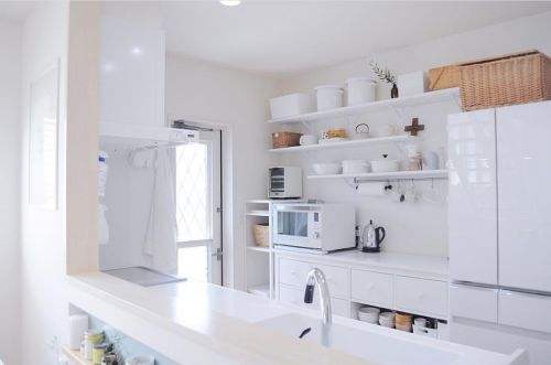 日本的廚房區域一般都會有精裝的布置,還會搭配同風格的餐椅。不過有的廚房空間比較狹窄,甚至沒有放椅子的地方,也有人會把操作臺及餐桌臺面加高,變成酒吧風格,擺放在可收藏在臺面下面的高凳或站著喝酒用餐,也是別有一番風味。