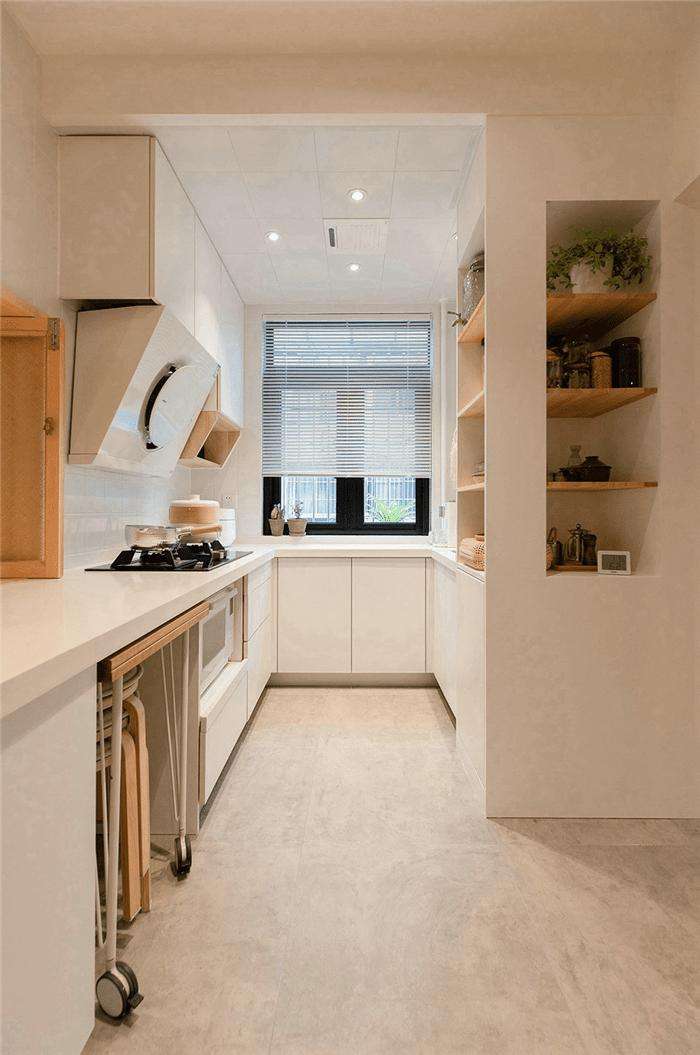如果是半開放性的“I”型廚房,也可以摒棄餐桌改為操作臺面的設計,或是在操作臺背面設計成放置臺面,這樣做出的菜品可以直接放在臺面上,吃飯時也很方便。