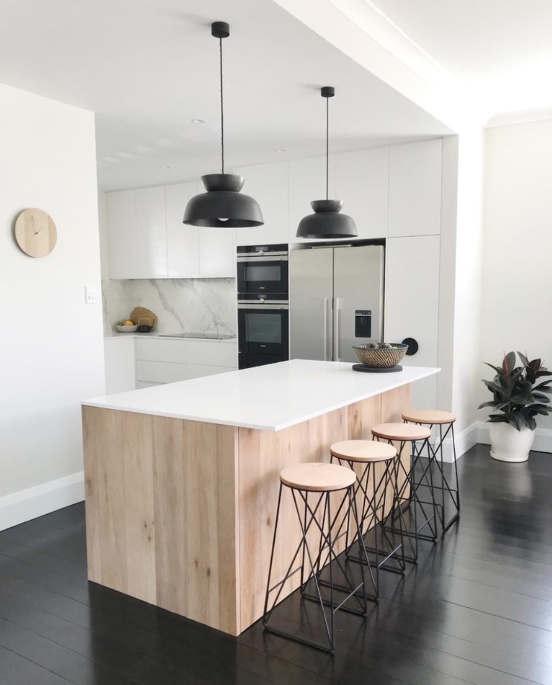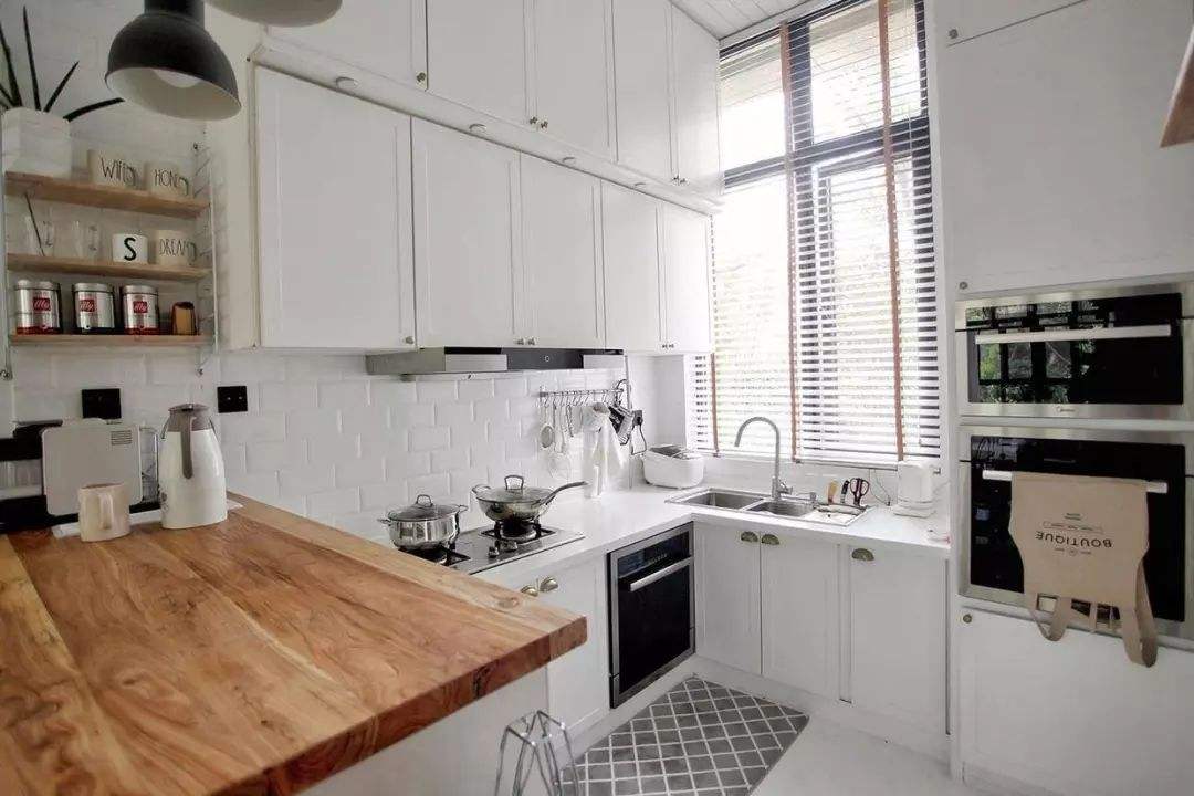 進深短的空間也可以考慮“コ”字型廚房,這個也很適合廚具、餐具等廚房用具較多的家庭,由于收納空間和臺面充分,即使沒有安裝櫥柜,微波爐、電飯鍋、鍋碗瓢盆等也都有地方收納和擺放。同時還能解決操作臺、烹飪臺、餐桌三位一體的問題。開放的空間,也能使廚房區域看起來更寬敞。