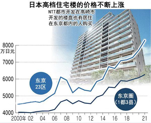 東京圈2022年上半年的新房上市套數為1萬2716套,同比減少4.2%,新建住宅發售套數在最近20多年里減少至3分之1左右。新房房源不足,房價上漲,東京23區2021年上市的新建高檔住宅樓的均價同比上漲7.5%,達到8293萬日元(約合人民幣401.49萬元),部分優質地段的新房上漲甚至超過20%。開發商似乎也并不著急銷售,在房子竣工前分期分批少量放盤,對市場也造成了房源緊俏的情況。