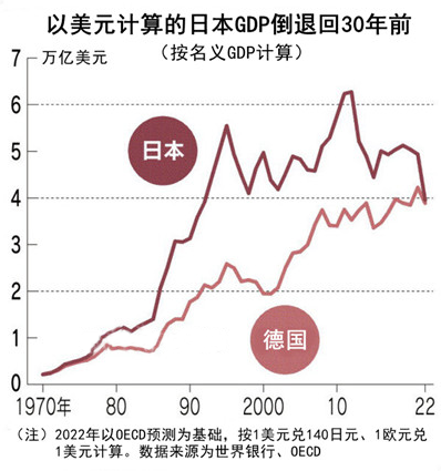 隨著疫情及俄烏沖突的進程,美國為了抑制本國通脹不斷進行加息的行為,使得日元不斷貶值,進一步加重了日本的經濟壓力,更令日本以美元計價的GDP直接倒退回30年前。