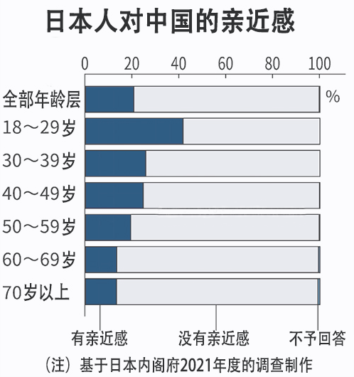 為了力求真相,小編經過不懈努力,終于在日本權威媒體找到了可靠信息。2021年度,日本內閣府在3000名15歲以上的日本人中實施的調查顯示,“有親近感”的占20%,“沒有親近感”的占79%。