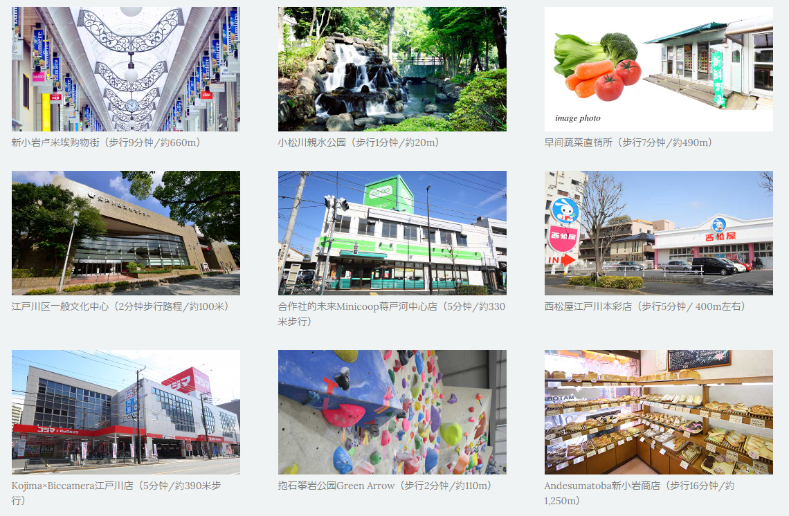 距小松川親水公園(步行1分鐘/約20m)、新小巖盧米埃購物街(步行9分鐘/約660m)、江戸川區(qū)一般文化中心(2分鐘步行路程/約100米)、早間蔬菜直銷所(步行7分鐘/約490m)、Kojima×Biccamera江戸川店(5分鐘/約390米步行)、抱石攀巖公園Green Arrow(步行2分鐘/約110m)