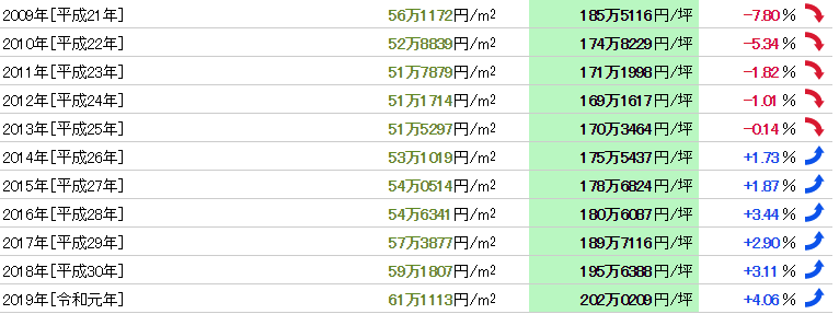 從1983年(昭和58年)開始37年的數(shù)據(jù),公示地價(jià)的最高值是200萬5526日元/㎡(1991年)最低值是52萬2045日元/㎡(2001年),兩者的落差是3.84倍。基準(zhǔn)地價(jià)的最高值是164萬4157日元/㎡(1990年)最低價(jià)格是43萬5482日元/㎡(2005年),兩者的落差是3.78倍