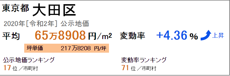東京都大田區(qū)最新公示地價(jià)平米單價(jià)平均為65萬8908日元/㎡2020年“令和2年”),坪單價(jià)平均為217萬8208日元/坪全國排名第17位。從去年開始的變動(dòng)率是+4.36%,變動(dòng)率的全國排名是71位