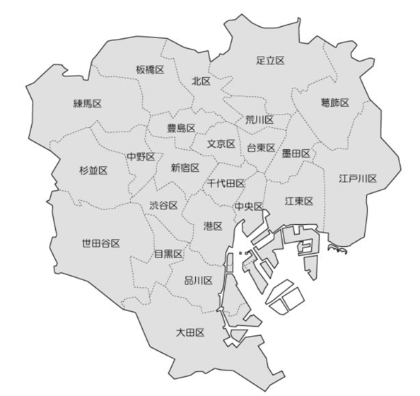 東京23區包括千代田區、中央區、港區、新宿區、文京區、臺東區、墨田區、江東區、品川區、目黑區、大田區、世田谷區、渋谷區、中野區、杉並區、豐島區、北區、荒川區、板橋區、練馬區、足立區、葛飾區和江戶川區。