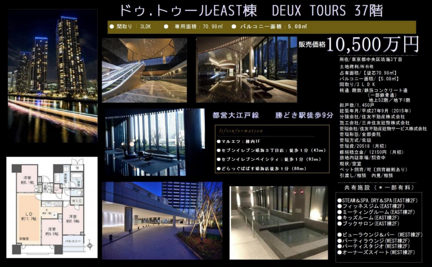 DEUX TOURS周邊配套也很完善,除了超市外,周邊還有多個(gè)便利店、藥妝店、餐廳等,還有黎明橋公園、診所、郵局、警察署、月島第三小學(xué)、晴海中學(xué)等,均在步行圈內(nèi)。