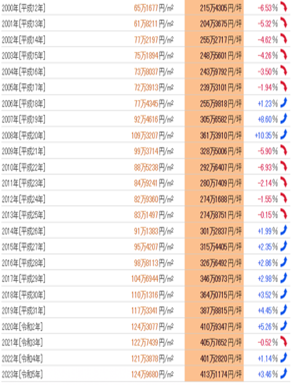 基準(zhǔn)地價(jià)平均為每平方米126萬(wàn)6073日元(2022年),每坪418萬(wàn)5367日元,與前一年相比增長(zhǎng)了+2.38%。
