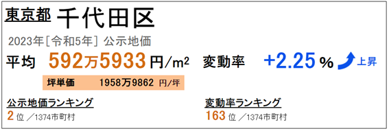 東京千代田區(qū)最新公布的土地價格為每平方米5,925,933日元(截至2023年[令和5年]),每坪(3.3平方米)的平均價格為19,589,862日元,位居全國第二。同比增長率為+2.25%,增長率排名全日本第163位。