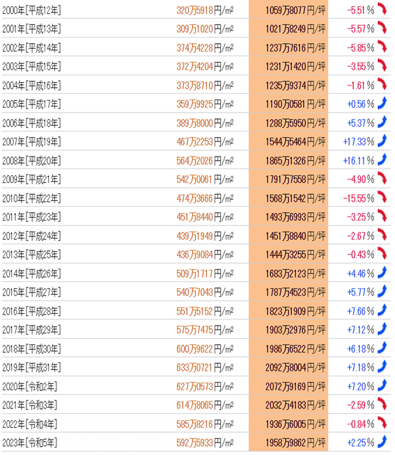 自1983年(昭和58年)以來40年的數(shù)據(jù),1991年公布千代田區(qū)的最高土地價格為每平方米15,577,307日元,而1983年的最低土地價格為每平方米2,160,434日元,相差7.21倍。最高的標準土地價格為1990年的每平方米15,583,636日元,最低為1983年的每平方米2,618,260日元,相差5.95倍。