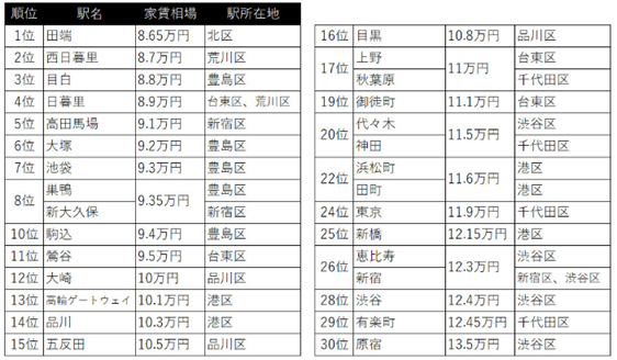 雖然已經知道位于北側的車站租金相對較為合理,但是如果把JR山手線以JR中央線為中間基準分為南北兩側的話,顯然位于南側的車站更加方便。但如果您仍希望盡可能地控制租金,那么應該選擇哪個車站呢?根據排名,從高輪ゲートウェイ站(第13位,租金相對較為便宜的10萬1000日元)到品川站(第14位,同樣是10萬3000日元)到大崎站(第12位,同樣是10萬日元)再到五反田站(第15位,同樣是10萬5000日元)再到目黑站(第16位,同樣是10萬8000日元),連續的這5個車站似乎是不錯的選擇。雖然位于南側的大多數車站的租金相對較高,超過了11萬日元,但這5個車站的租金相對較為便宜,僅在10萬日元左右。