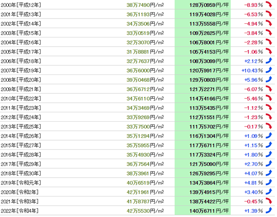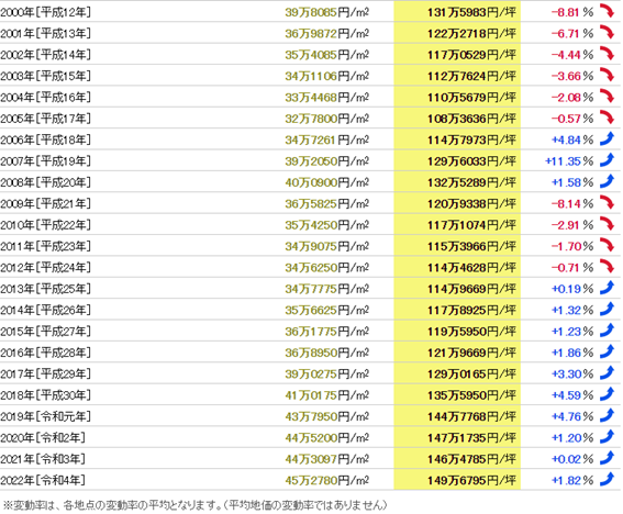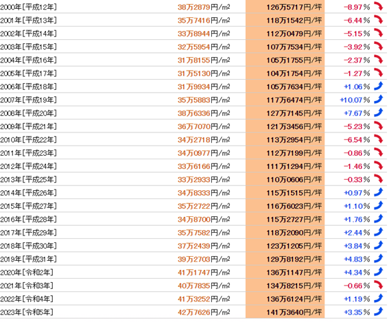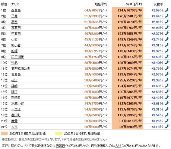 我們發布的東京都江戶川區土地價格的市場行情,是基于公示地價和基準地價的標準地/基準地數據,由我們獨立計算平均值和變動率,并按照東京都江戶川區在全日本市區町村中的排名進行統計。