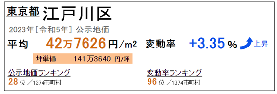 2023年(令和5年)發布的最新公示地價顯示,東京都江戶川區的地價為平均每平方米42萬7626日元,每坪地價平均為141萬3640日元,坪價格日本全國排名第28位。地價較去年上漲+3.35%,在日本全國變動率排名第96位。