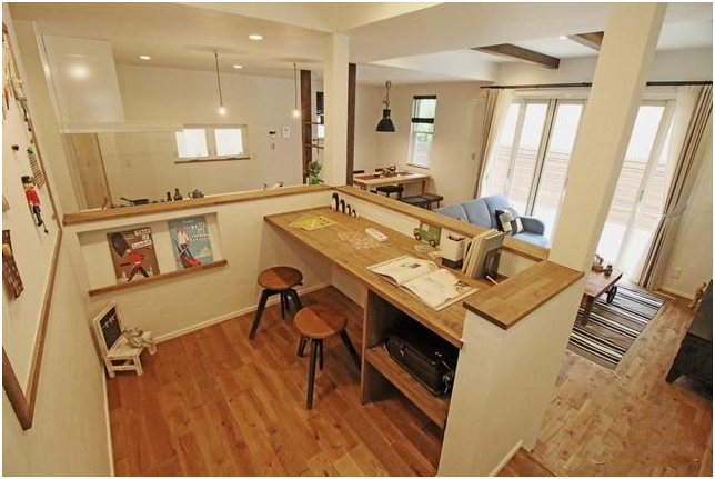 在參觀了日本許多新建房產項目后我們發現,現在日本起居室的空間除了廚房、餐客廳功能之外,大多新增了適合孩子們學習的功能區。這也是近來日本房間內部布局流行的新趨勢,特別是在疫情發生之后,孩子學習的功能區也成為了父母在家辦公的好地方。