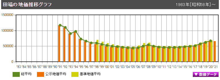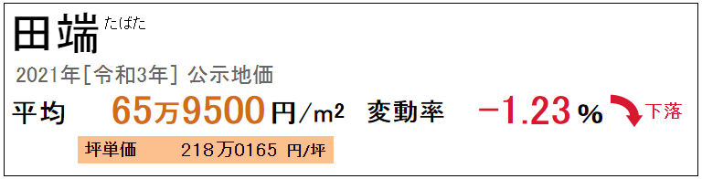 田端站是東京23區內北區及山手線上的車站,2021年公示地價為每平方米65.95萬日元,多年來呈持續上漲趨勢,因受新冠疫情的影響下降了1.23%。