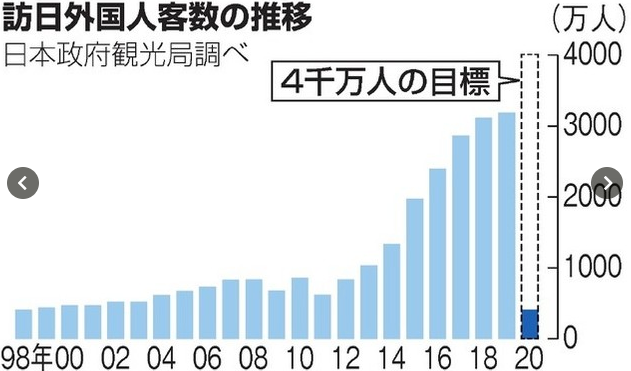 日本觀光廳于1月20日對外發布了該消息。日本政府于2020年2月開始,面向中國及韓國部分地區的游客實施了入境限制。自3月以后,又將入境限制范圍擴大到了中韓全境及歐美等地區。結果2020年2月到訪日本的人數比上年同期減少了58%,3月則減少了93%,4月至12月則減少了97%至99%。日本政府當初以如期舉辦2020年東京奧運會及殘奧會為目標,2020年的訪日客人數預期將達到4000萬人,然而實際的訪客人數僅為設定目標的約十分之一。