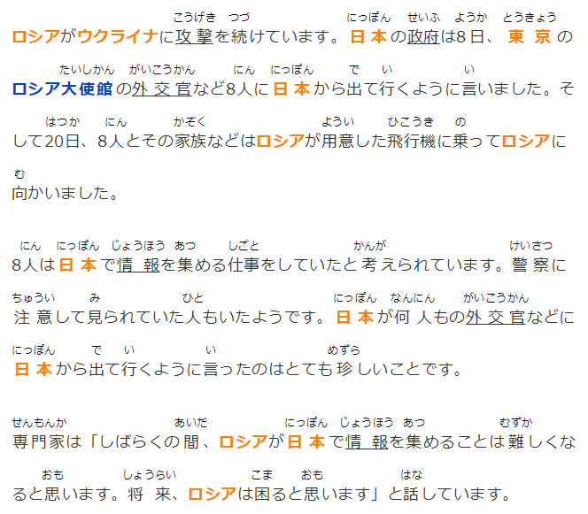 ロシアがウクライナに攻撃を続けています。日本の政府は8日、東京のロシア大使館の外交官など8人に日本から出て行くように言いました。そして20日、8人とその家族などはロシアが用意した飛行機に乗ってロシアに向かいました。