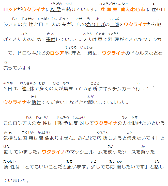 ロシアがウクライナに攻撃を続けています。兵庫県南あわじ市に住むロシア人の女性と日本人の夫が、店の売り上げの一部をウクライナから逃げてきた人のために寄付しています。2人は車で料理ができるキッチンカーで、ピロシキなどのロシア料理と一緒に、ウクライナのピクルスなどを売っています。