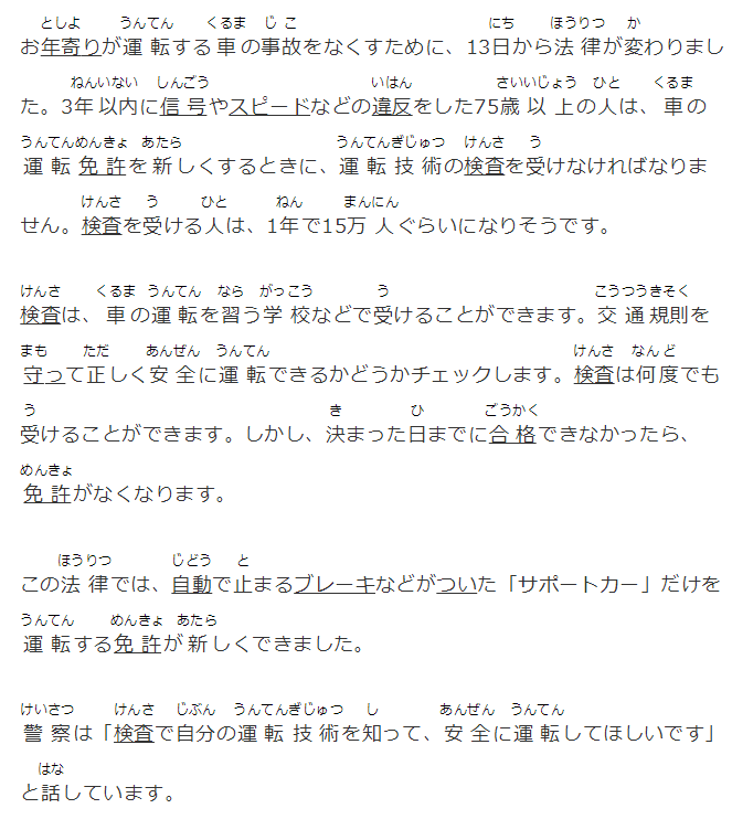お年寄りが運(yùn)転する車の事故をなくすために、13日から法律が変わりました。3年以內(nèi)に信號(hào)やスピードなどの違反をした75歳以上の人は、車の運(yùn)転免許を新しくするときに、運(yùn)転技術(shù)の検査を受けなければなりません。検査を受ける人は、1年で15萬人ぐらいになりそうです。