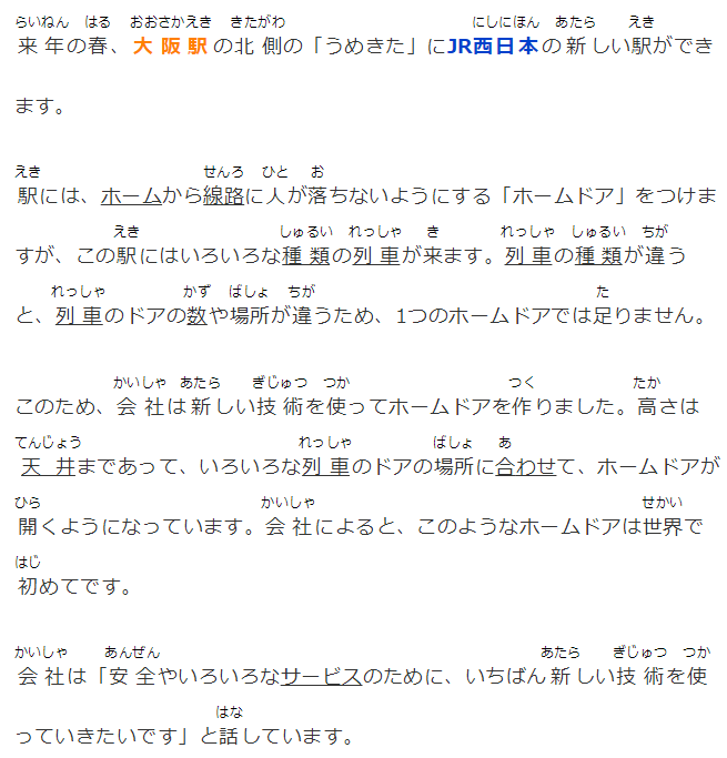 6月27日,計劃安裝在大阪站北側梅北地區新車站的新式站臺門與媒體進行了見面。車站運營商JR西日本公司稱,這將是全球首例投入運營的可移動式全高站臺門。