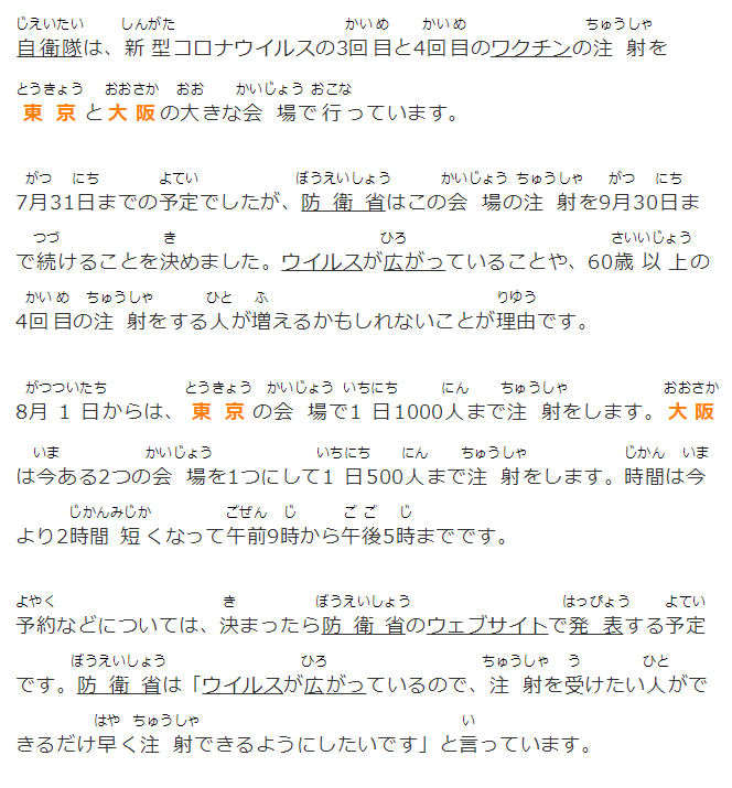 予約などについては、決まったら防衛(wèi)省のウェブサイトで発表する予定です。防衛(wèi)省は「ウイルスが広がっているので、注射を受けたい人ができるだけ早く注射できるようにしたいです」と言っています。