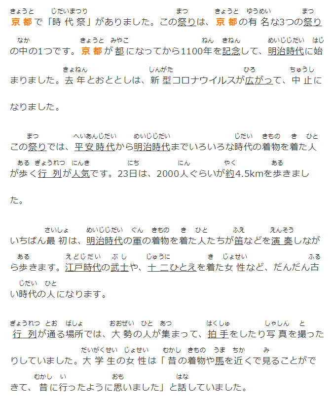 京都で「時代祭」がありました。この祭りは、京都の有名な3つの祭りの中の1つです。京都が都になってから1100年を記念して、明治時代に始まりました。去年とおととしは、新型コロナウイルスが広がって、中止になりました。